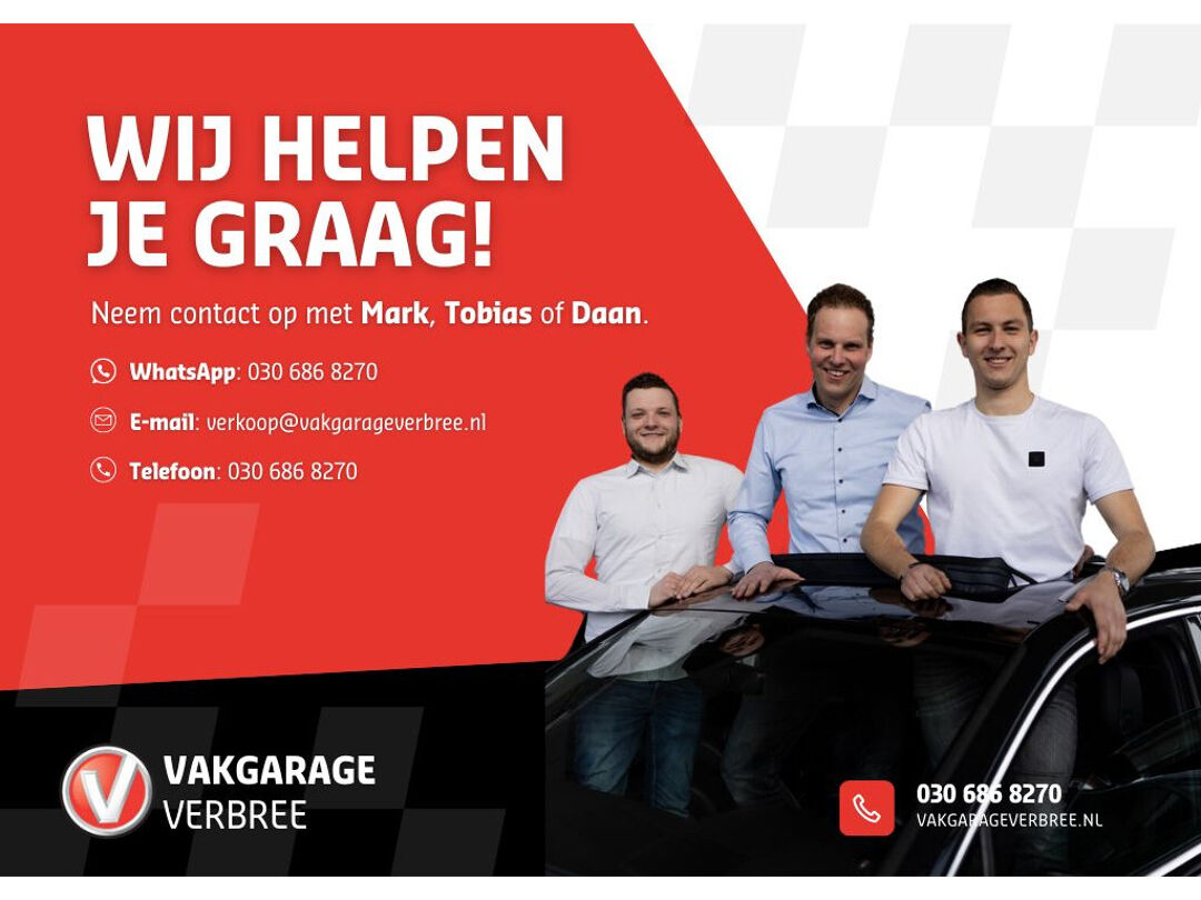 Wat leuk dat u deze auto heeft gevonden! Wij zijn Vakgarage Verbree; als familiebedrijf combineren wij de voordelen van een moderne autodealer met de persoonlijke benadering van een dorpsgarage. Uw adviseurs Tobias, Mark, Swen en Daan vertellen u graag meer. Bereikbaar via telefoon: 030-6868277 of WhatsApp: 030-6868270.