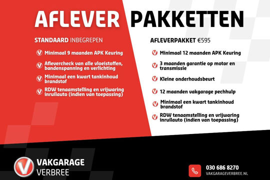 De prijs is inclusief minimaal 9 maanden APK, controle van vloeistoffen, verlichting en bandenspanning, een kwart tank brandstof en RDW tenaamstelling. Bij ons heeft u de keuze de aflevervoorwaarde uit te breiden, zie hiervoor het extra afleverpakket in de fotogalerij van deze auto.